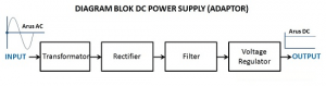 Sebuah DC Power Supply atau Adaptor pada dasarnya memiliki 4 bagian utama agar dapat menghasilkan arus DC yang stabil. Keempat bagian utama tersebut diantaranya adalah Transformer, Rectifier, Filter dan Voltage Regulator. Sebelum kita membahas lebih lanjut mengenai Prinsip Kerja DC Power Supply, sebaiknya kita mengetahui Blok-blok dasar yang membentuk sebuah DC Power Supply atau Pencatu daya ini. Dibawah ini adalah Diagram Blok DC Power Supply (Adaptor) pada umumnya.