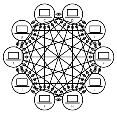 Tapi dapat menjadi rumit. Jika Anda mencoba menghubungkan, sepuluh komputer, Anda memerlukan 45 kabel, dengan sembilan colokan per komputer!