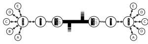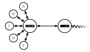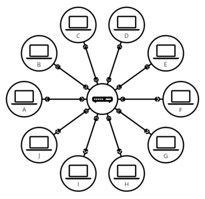 Setelah kita menambahkan hub, atau switch atau router ke sistem, jaringan dari 10 komputer kita hanya membutuhkan 10 kabel: satu pasang untuk setiap komputer dan perangkat dengan 10 colokan