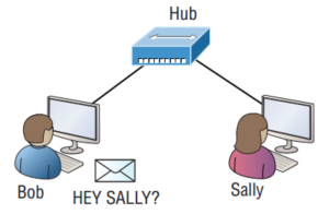 Gambar ini menunjukkan jaringan area lokal (LAN) dasar yang terhubung menggunakan hub, yang pada dasarnya hanyalah perangkat lama yang menghubungkan kabel bersama.