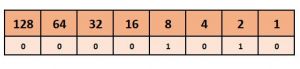 Selanjutnya masukkan bilangan biner ke dalam masing-masing kolom tersebut. Misalnya kita akan mengkonversi 00001010 ke dalam desimal. Maka caranya bisa Anda lihat pada gambar di bawah ini.
